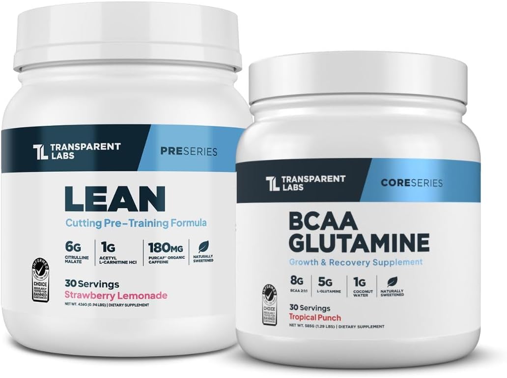 Transparent Labs Lean Pre-Workout Powder (30 Servings, Strawberry Lemonade) & BCAA Glutamine (30 Servings, Tropical Punch)