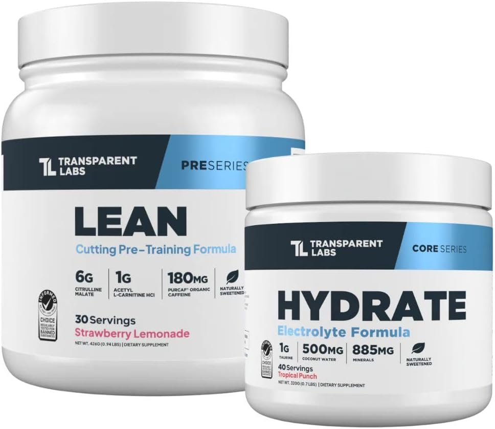 Transparent Labs Lean Pre-Workout & Hydrate Bundle combines two complementary formulas designed for fat-loss and body re-composition training. The pre-workout powder contains citrulline and beta-alanine for energy and endurance, while the electrolyte formula provides hydration support.
