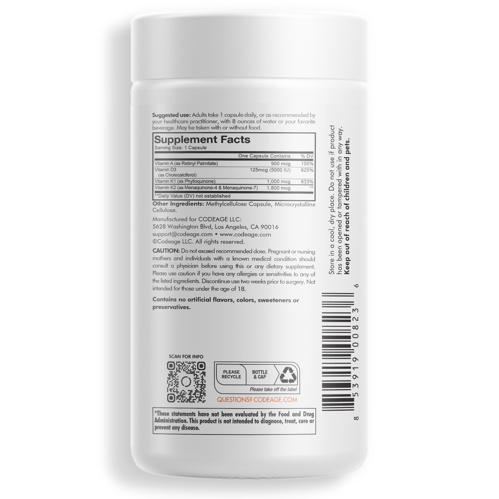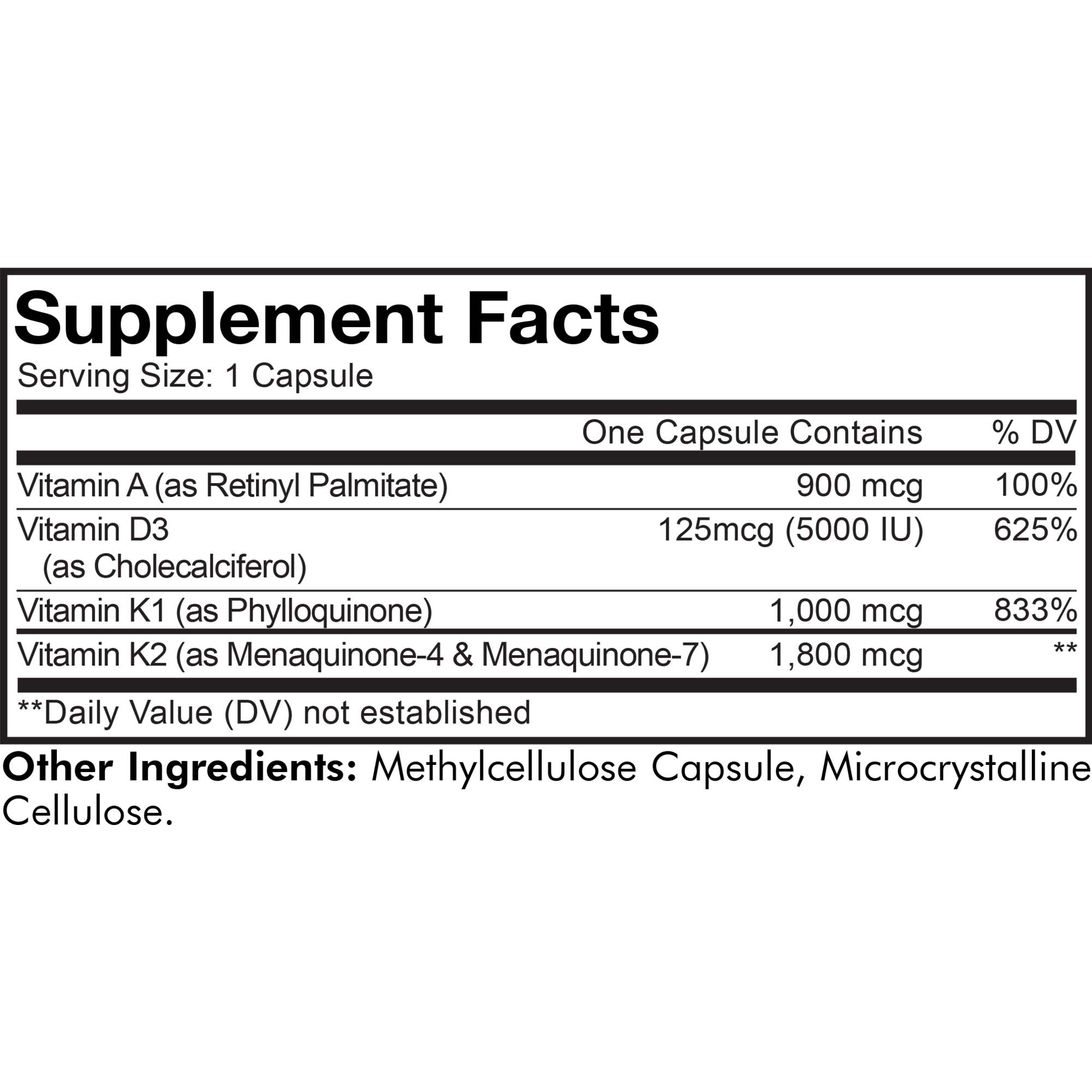 Each capsule delivers 900 mcg of vitamin A (as retinyl palmitate), 125 mcg of vitamin D3 (5000 IU), 1000 mcg of vitamin K1, and vitamin K2 as 1500 mcg MK4 and 300 mcg MK7. These nutrients are known to work synergistically to promote calcium balance and overall wellness.*