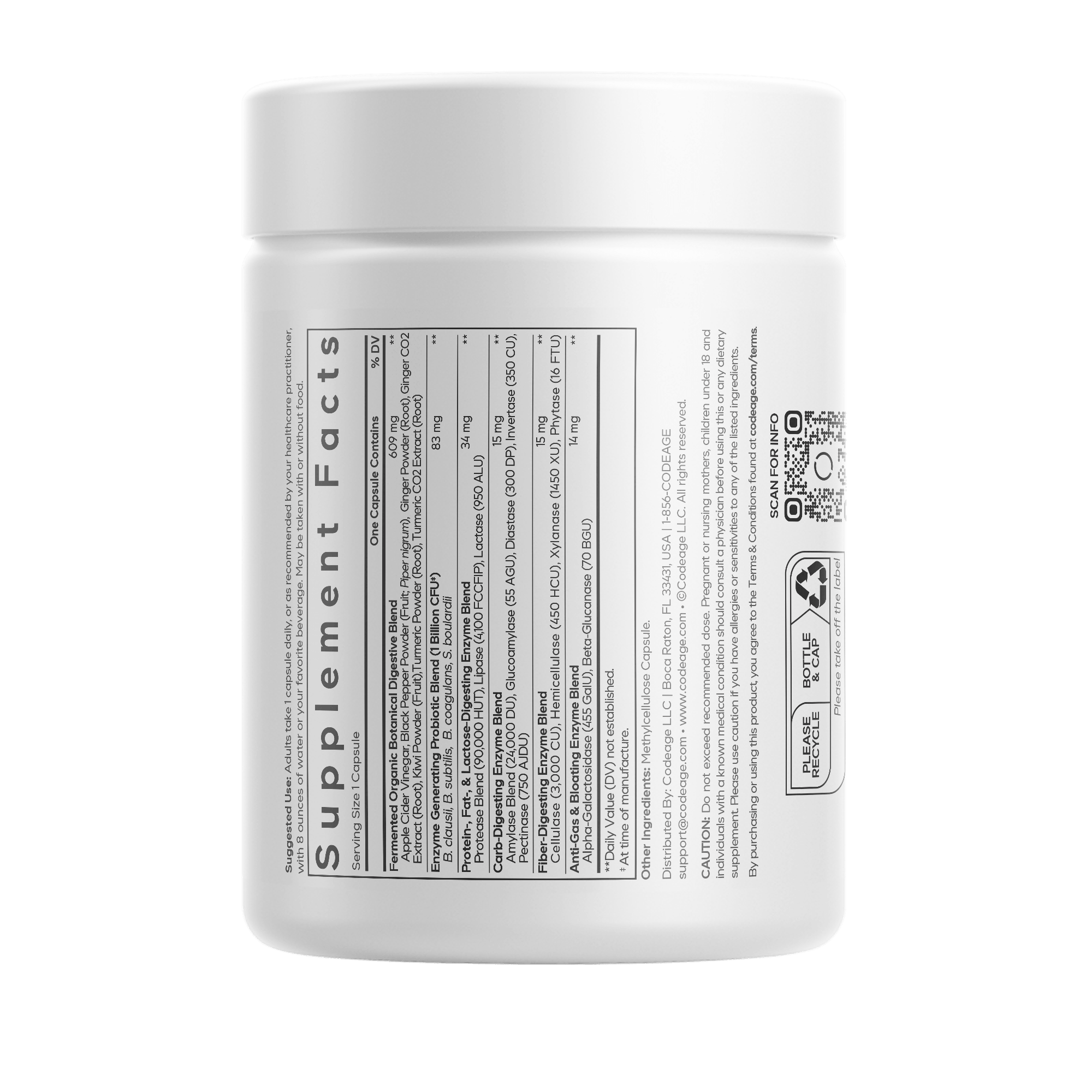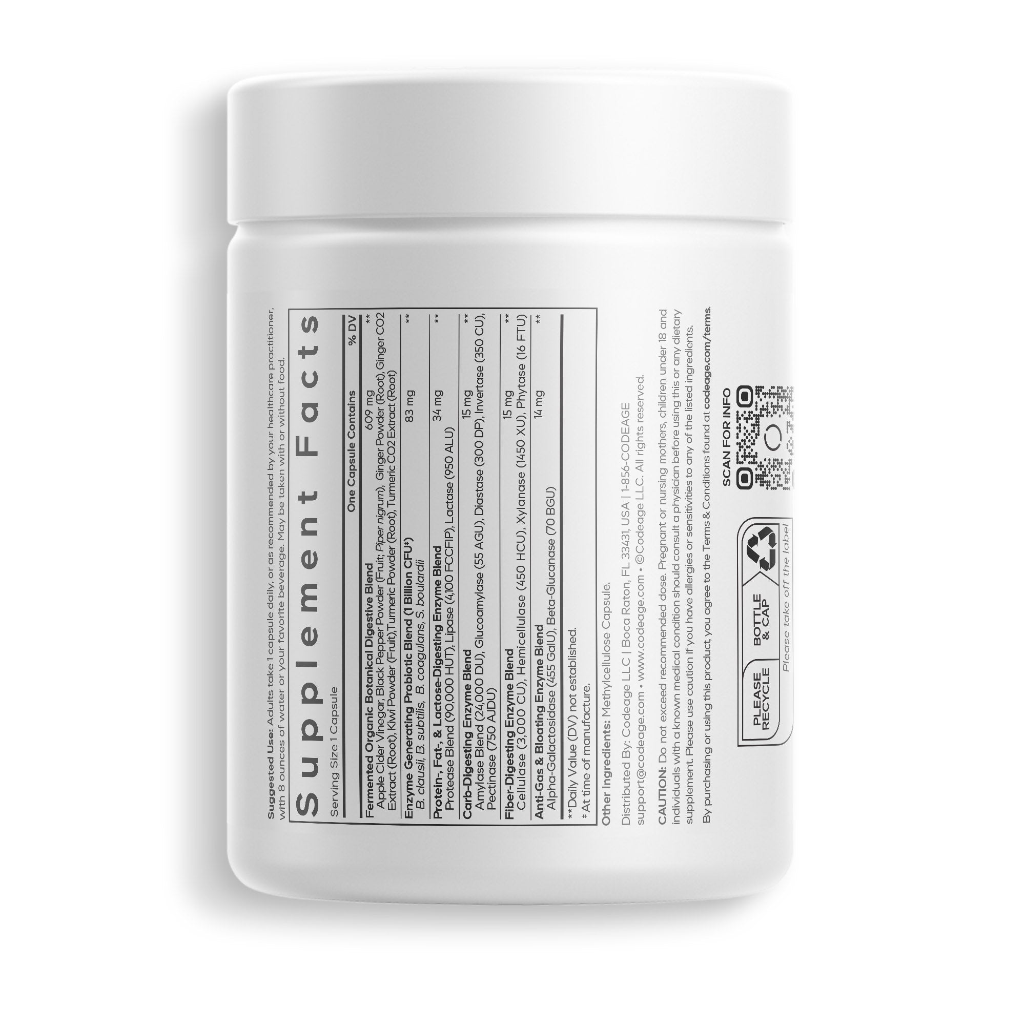 This plant-based formula includes enzymes such as amylase, lipase, lactase, and protease to help break down proteins, fats, carbs, and fibers. Enhanced with probiotics like B. subtilis and S. boulardii, it supports a healthy gut environment. Fermented botanicals including ginger, turmeric, kiwi, and apple cider vinegar provide additional digestive support.