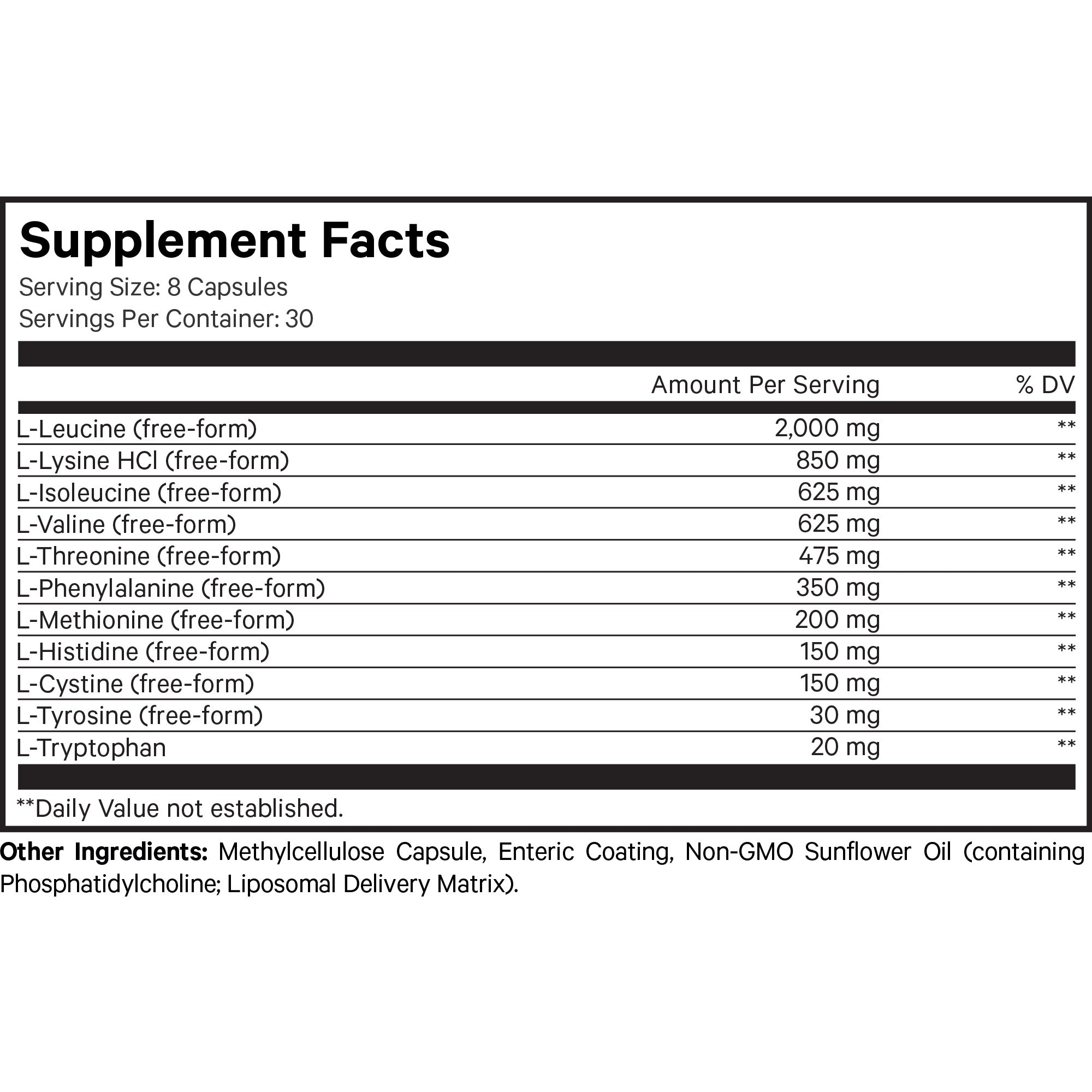 Each serving delivers a complete profile of free-form amino acids including L-Leucine, L-Lysine HCL, L-Isoleucine, L-Valine, L-Threonine, L-Phenylalanine, L-Methionine, L-Histidine, L-Cystine, L-Tyrosine, and L-Tryptophan. These nutrients are important for protein synthesis and overall muscle support.