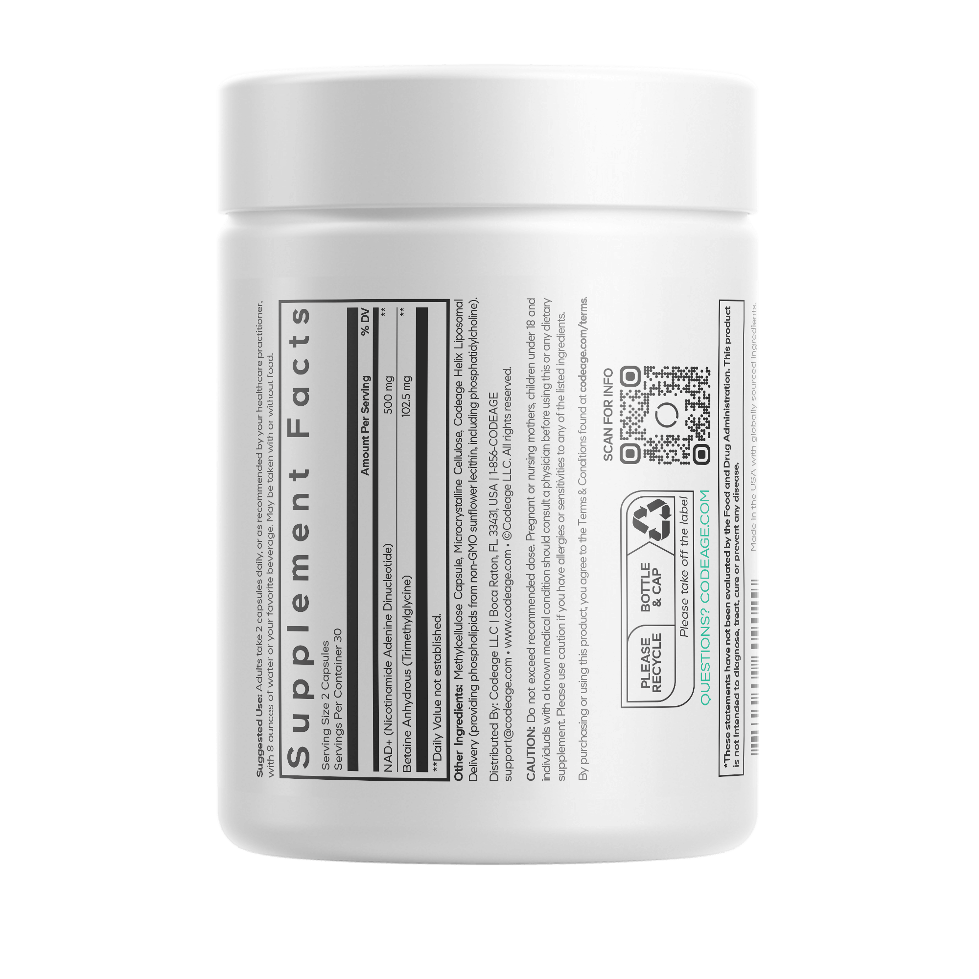 Codeage Liposomal NAD+ Supplement offers a high-quality formula designed to support energy production, metabolic health, and overall vitality. Each serving delivers 500mg of Nicotinamide Adenine Dinucleotide (NAD+), a vital coenzyme involved in numerous cellular functions. Enhanced with Betaine Anhydrous (Trimethylglycine), this supplement is formulated for individuals pursuing their wellness and healthy aging goals.