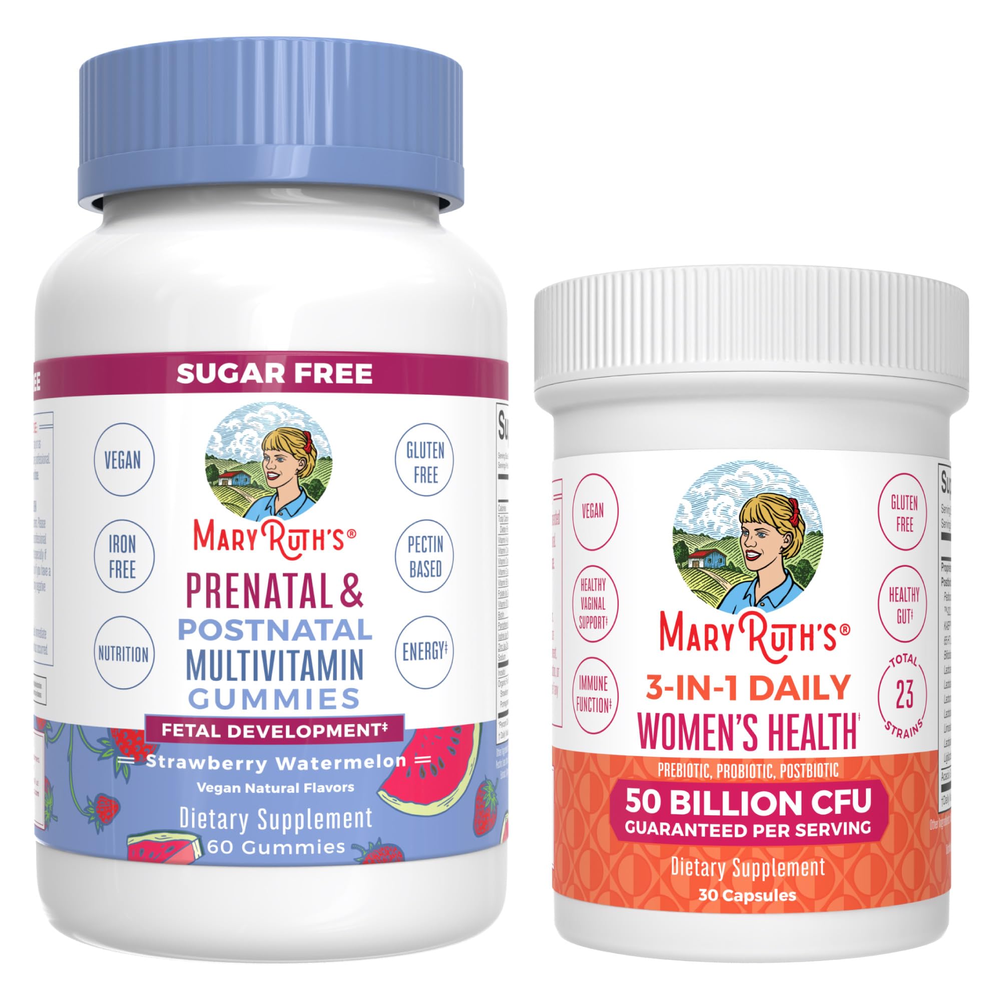 This bundle combines MaryRuth Organics Prenatal & Postnatal Multivitamin Gummies (Strawberry) with Women's 3-in-1 Daily Probiotic Capsules in one convenient set. The multivitamin gummies are designed for use during prenatal and postnatal stages, while the probiotic capsules are formulated for women's daily gut and overall wellness. Both products are vegan, non-GMO, and Clean Label Project Verified\u00ae for added quality assurance., The prenatal postnatal multivitamin gummies provide a targeted blend of vitamins and nutrients in a flavored gummy format, making them easy to take regularly. The Women's 3-in-1 Daily Probiotic Capsules are designed to support women's gut health and daily balance in capsule form. Clean Label Project Verified\u00ae status indicates that these products have been independently reviewed for certain quality standards, and the vegan, non-GMO formulas align with plant-based and ingredient-conscious lifestyles., This bundle is suitable for women looking for prenatal and postnatal multivitamin support along with daily probiotic supplementation in separate formats. It may be especially relevant for those seeking breastfeeding support and gut health focus within a clean-label, vegan, and non-GMO approach. As with any supplement regimen, women who are pregnant, nursing, or have medical conditions should consult a healthcare professional before use.