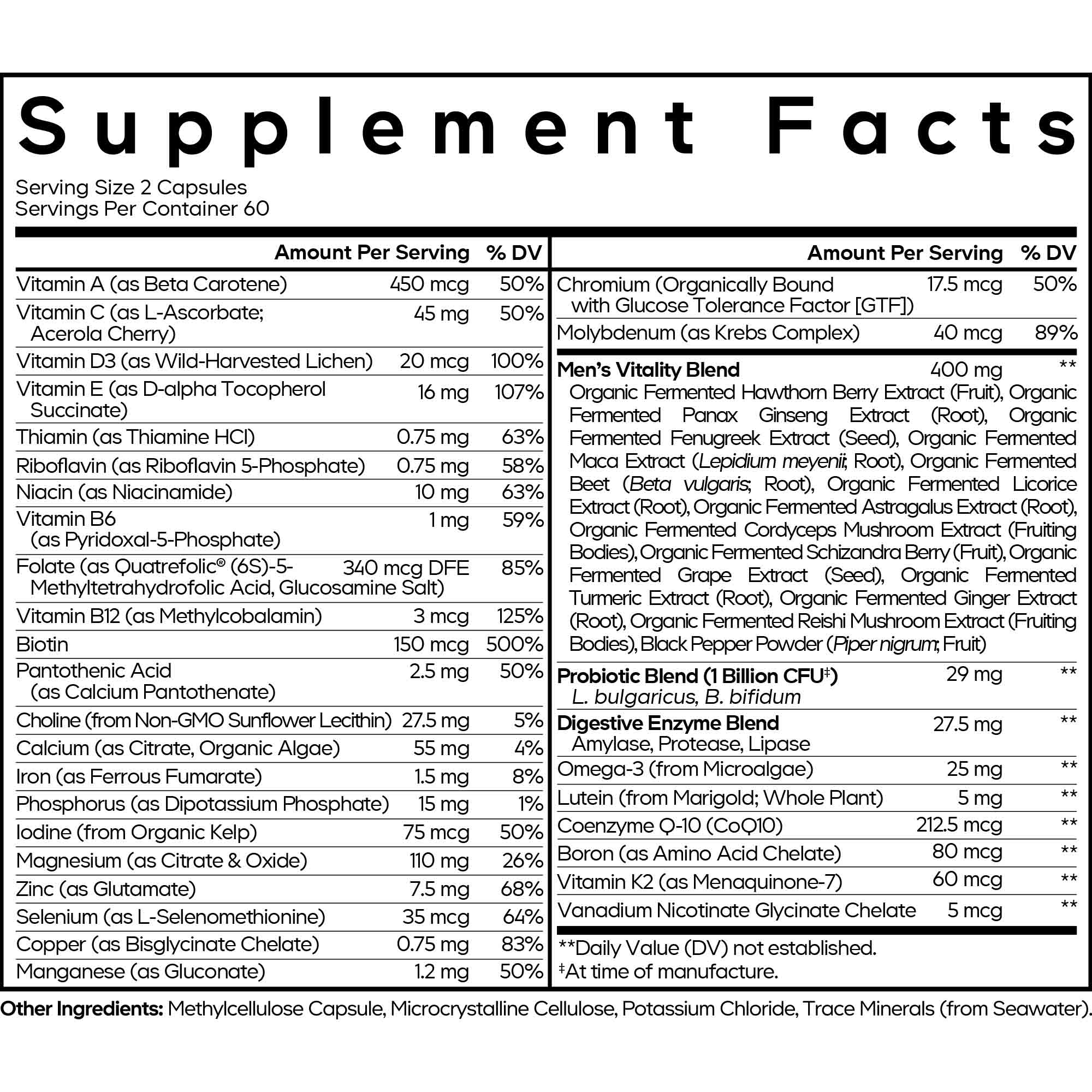 Formulated with a men's vitality blend featuring fermented herbal extracts like ginseng, maca, and turmeric, this multivitamin offers natural support for an active lifestyle. The inclusion of probiotics and digestive enzymes also promotes gut health and nutrient absorption.