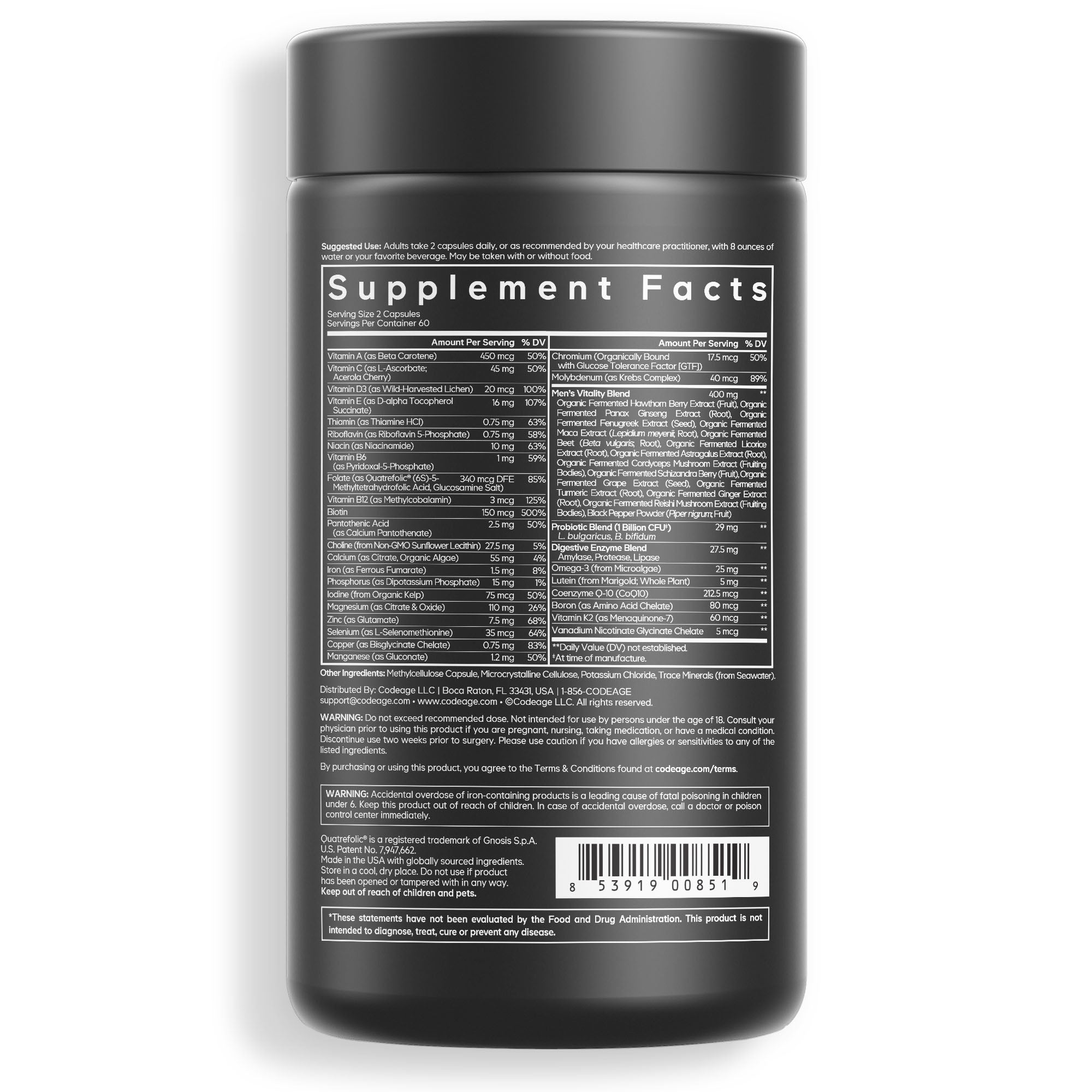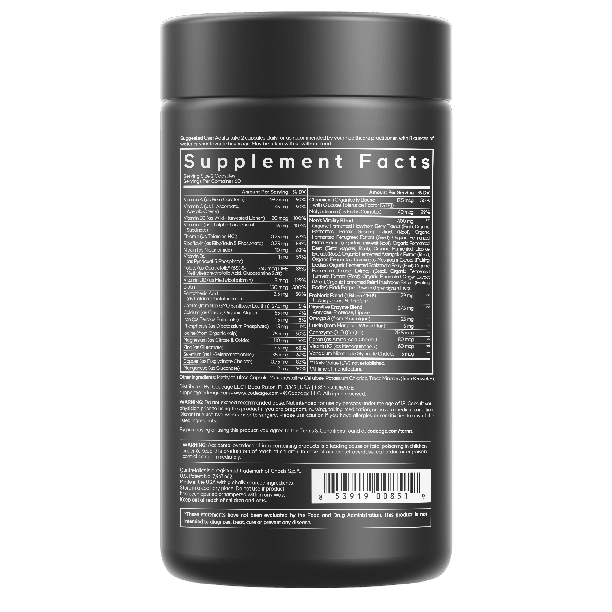 Codeage Men's Multivitamin is vegan, non-GMO, and free from dairy, soy, and gluten. Manufactured in the USA in a cGMP-certified facility using global ingredients, it reflects a commitment to quality, purity, and efficacy.