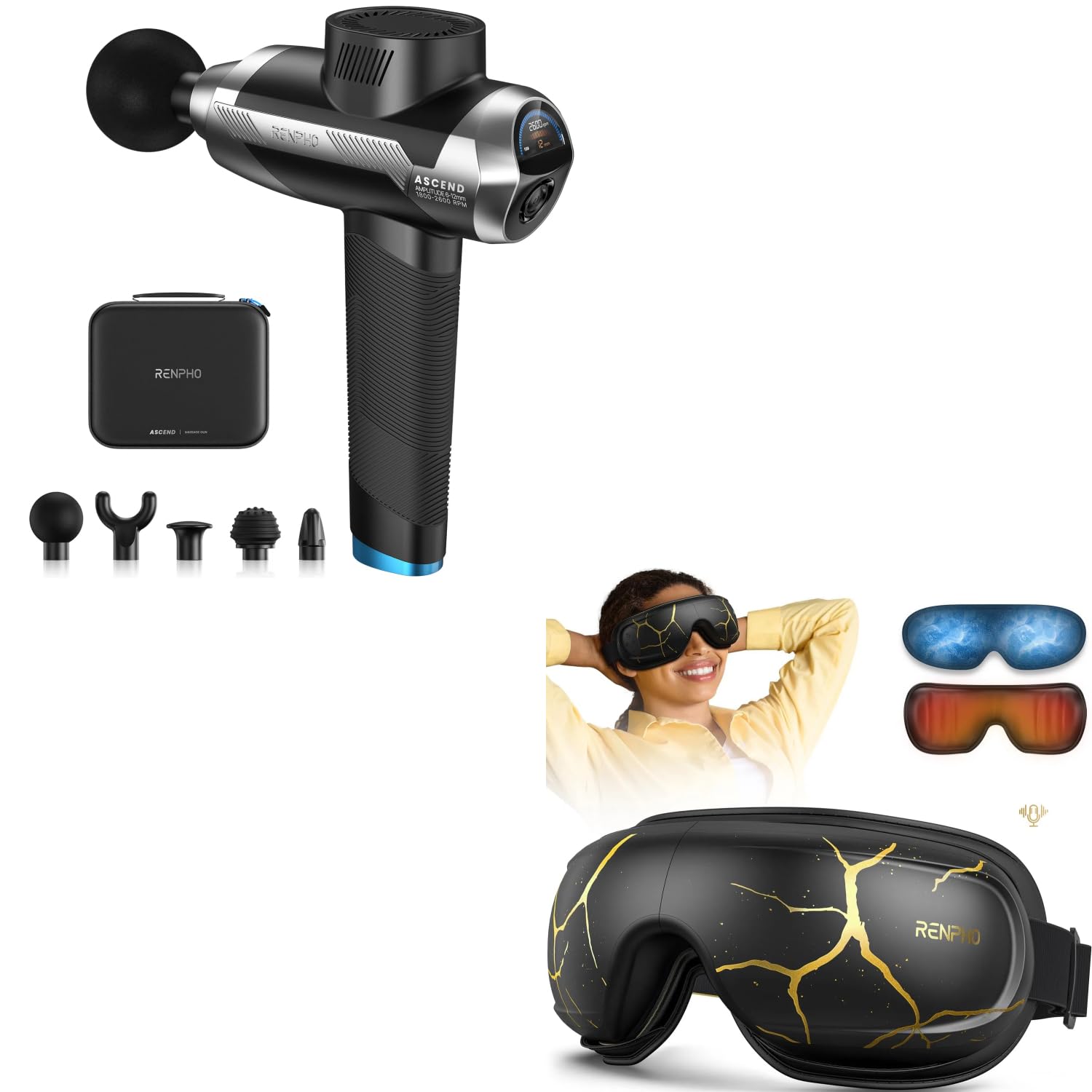 Support eye relaxation and comfort using the RENPHO Eyeris Kintsugi eye massager that is eligible for FSA and HSA use., Enjoy hands-free convenience with built-in voice control, activating the eye massager by saying \u201cHi Eyeris\u201d and choosing from 18 voice commands., Customize muscle relief with the deep tissue massage gun offering 7 amplitude settings from 6mm to 12mm for different needs and body areas., Maintain a secure, comfortable grip during longer sessions thanks to the ergonomic silicone handle designed for non-slip use., Offer a thoughtful present for fitness enthusiasts, providing a professional-style massage tool to support post-workout relaxation and recovery routines.