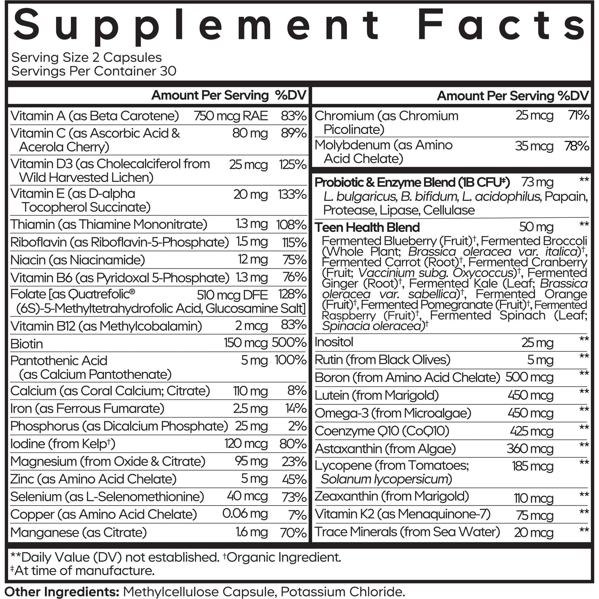 Daily Teen Multivitamin – Whole Food-Based, Probiotic-Enriched Formula for Active Teens – Vegan, Non-GMO, Gluten-Free – 60 Capsules